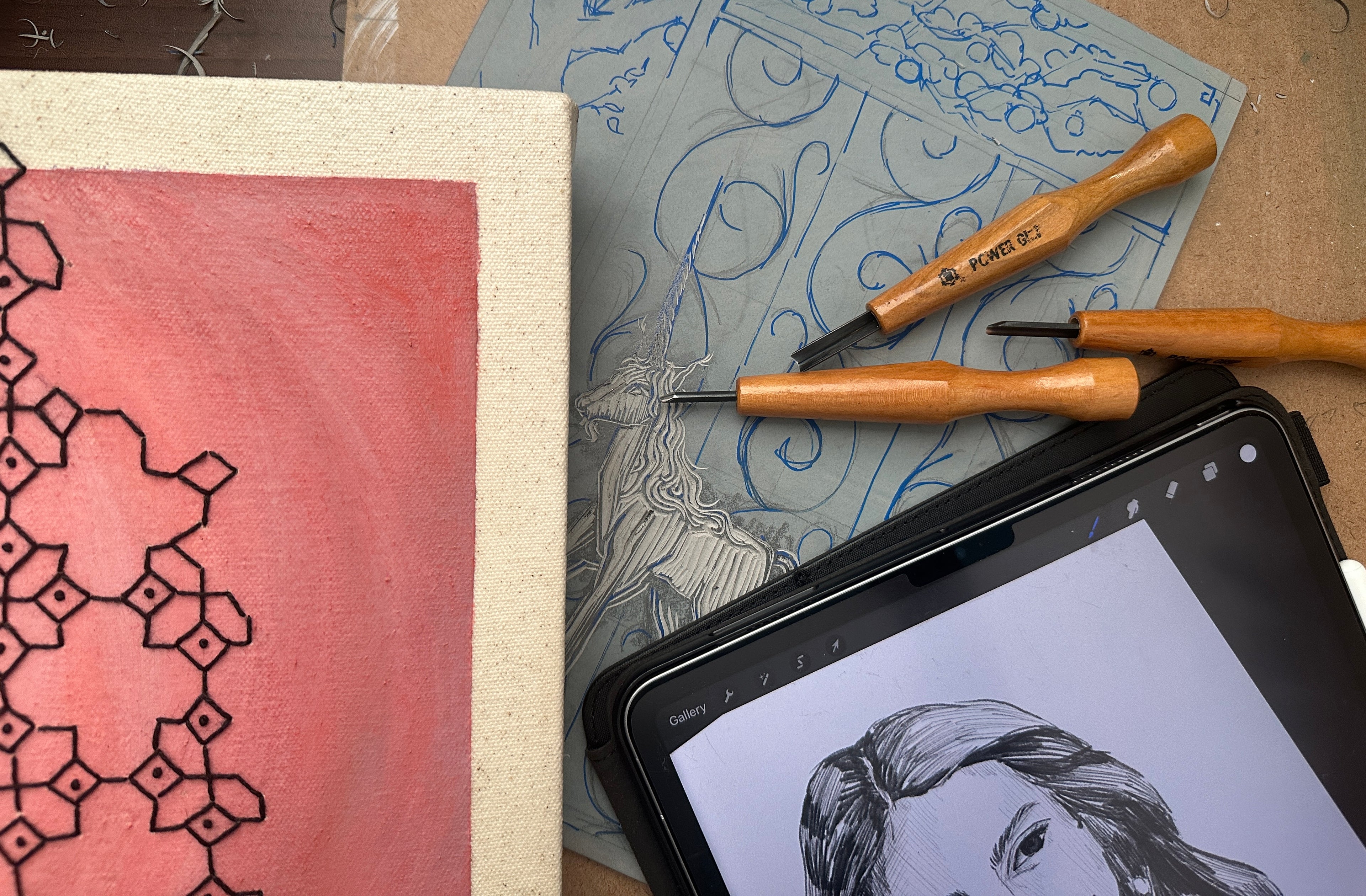 I work with a lot of different materials, and a lot of different styles. I particularly love the dichotomy of context between oil paint and textile art and experimenting with mediums that have been in us for as long as we have created. Follow me on instagram to see in process videos: @aria_osgu