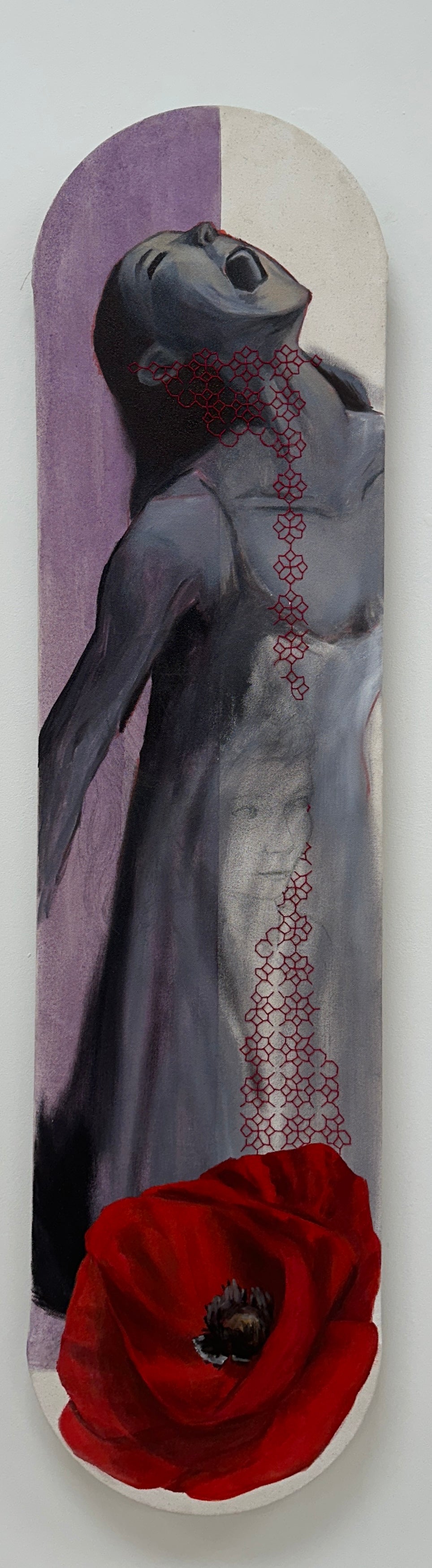Girlhood, 12"x54", oil and embroidery on canvas, 2025