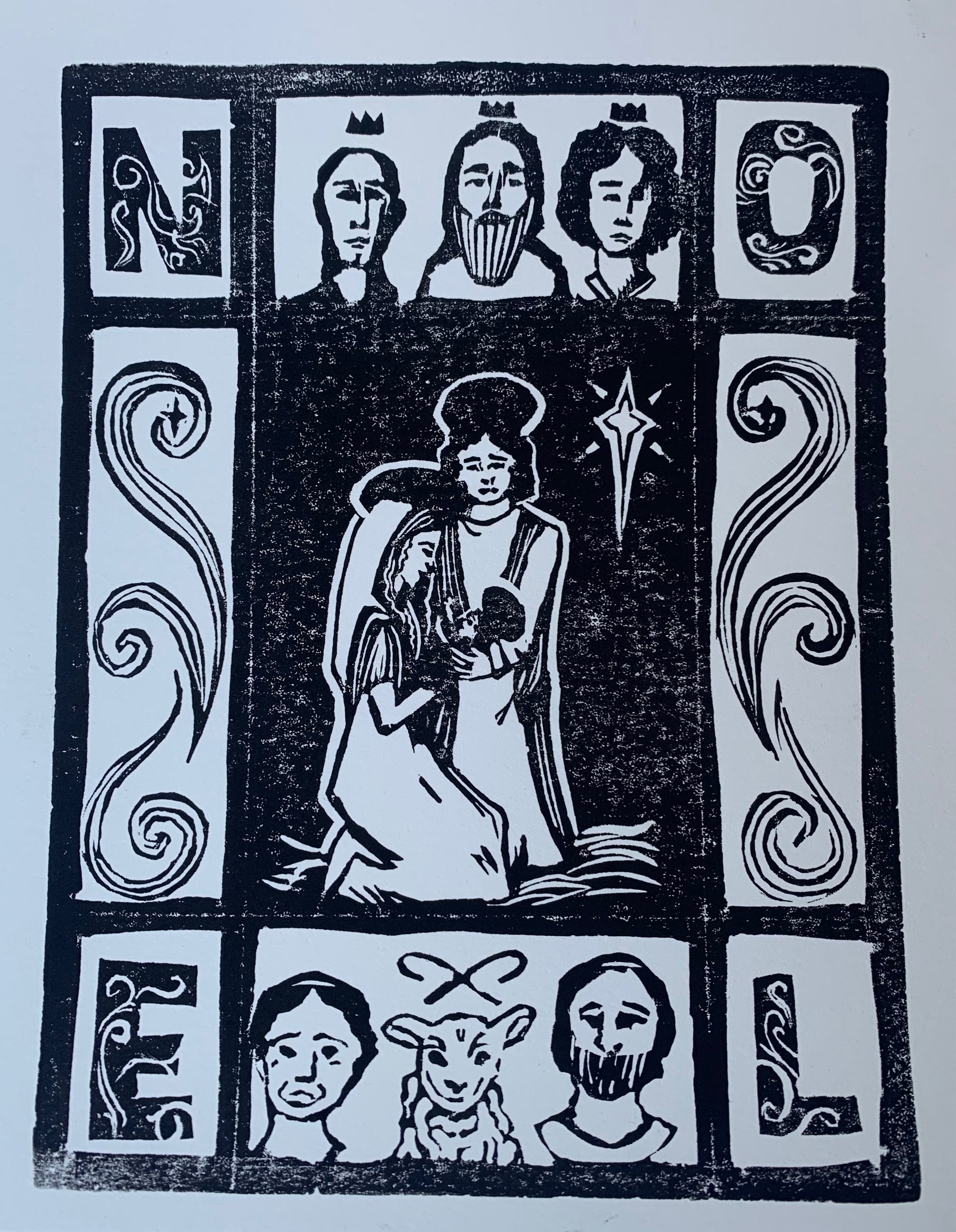 Noel, 12"x18", linoleum print, 2022